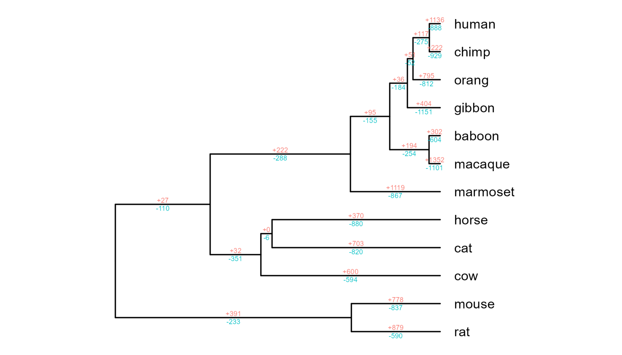 We can then plot the gene loss/gain values as text on branches, as is common practice for this kind of data.