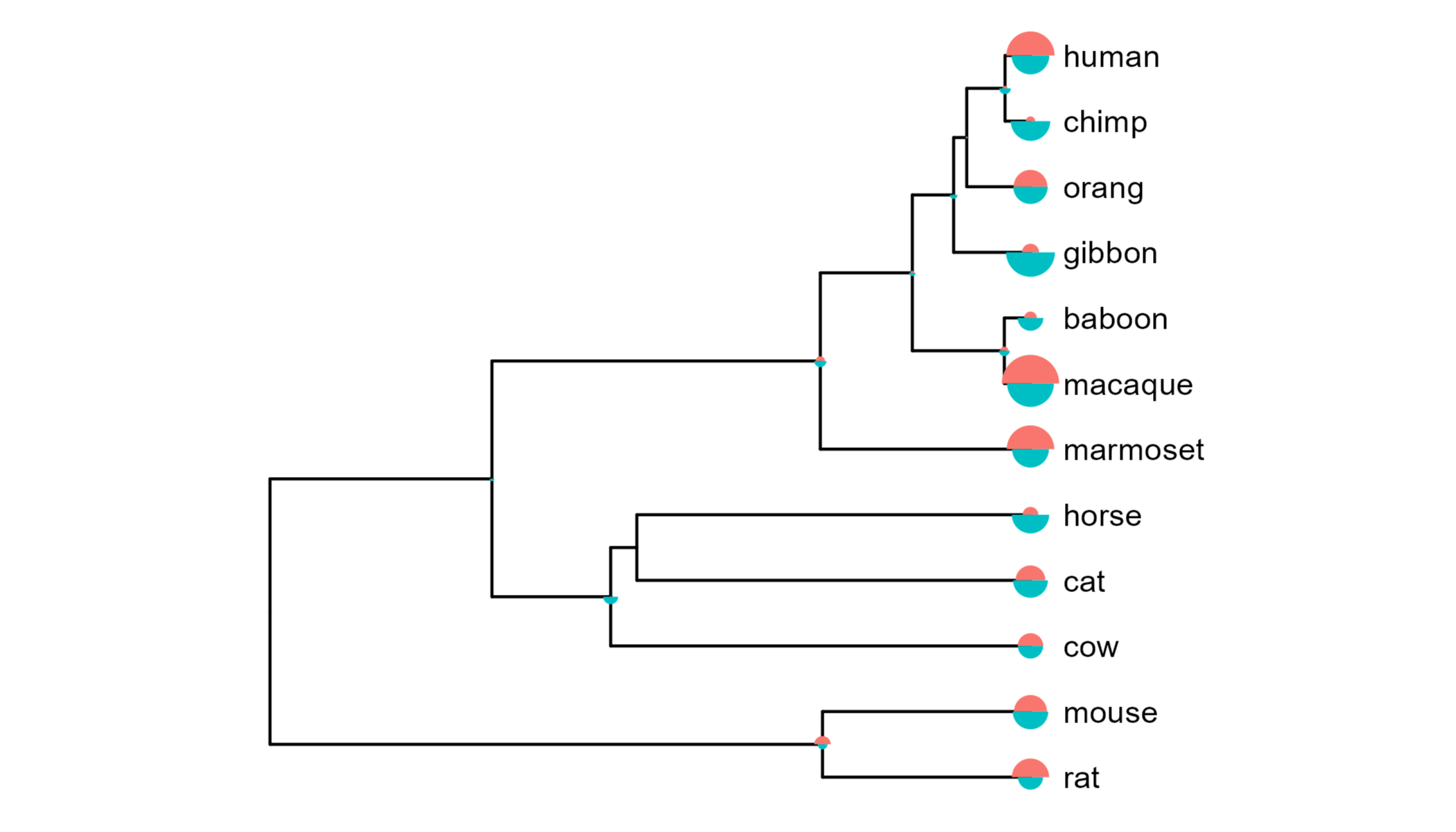 In brief, this kind of plot involves two semicircles which can each vary in their size to give an idea of relative difference in magnitude. It’s essentially a circularised bar plot, which I think is a bit neater to plot on phylogeny nodes compared to a normal bar plot.